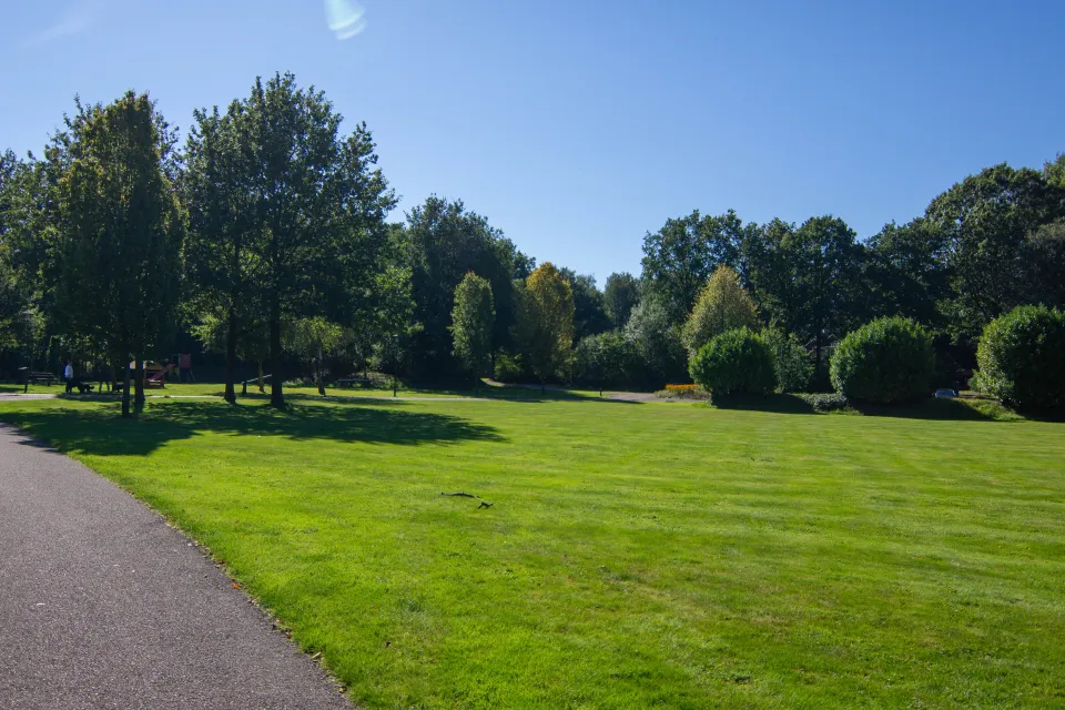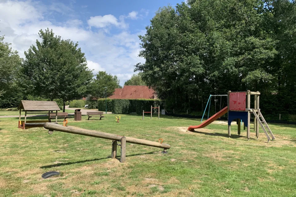 Am Eingang des Parks befindet sich der Spielplatz. Dort können die Kinder herumtollen. Es gibt u. a. eine Schaukel, ein Spielhaus und Reckstangen.