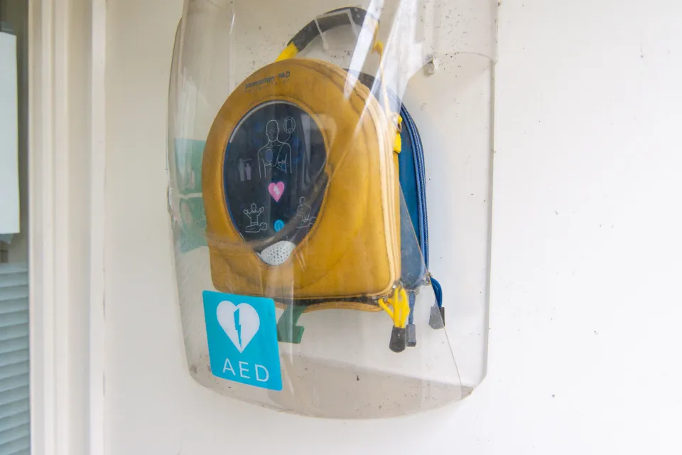 Am Empfangsgebäude hängt ein AED (Automatisierter Externer Defibrillator), der im Falle eines Herzstillstands eingesetzt werden kann.